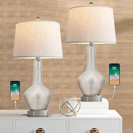 Amazon Com Oyears Usb Modern Table Lamps Set Of 2 Mercury Glass Table Lamps For Living Room 24 75 Bedroom Bedside Table Lamp With Drum Shade Home Improvement