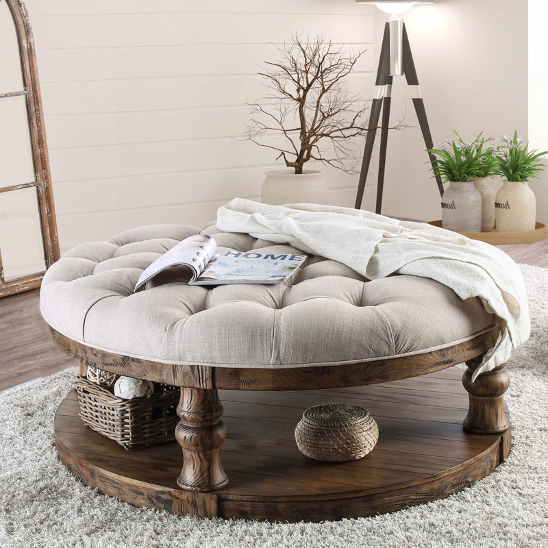 Round Light Grey Tufted Fabric Ottoman Cocktail Table