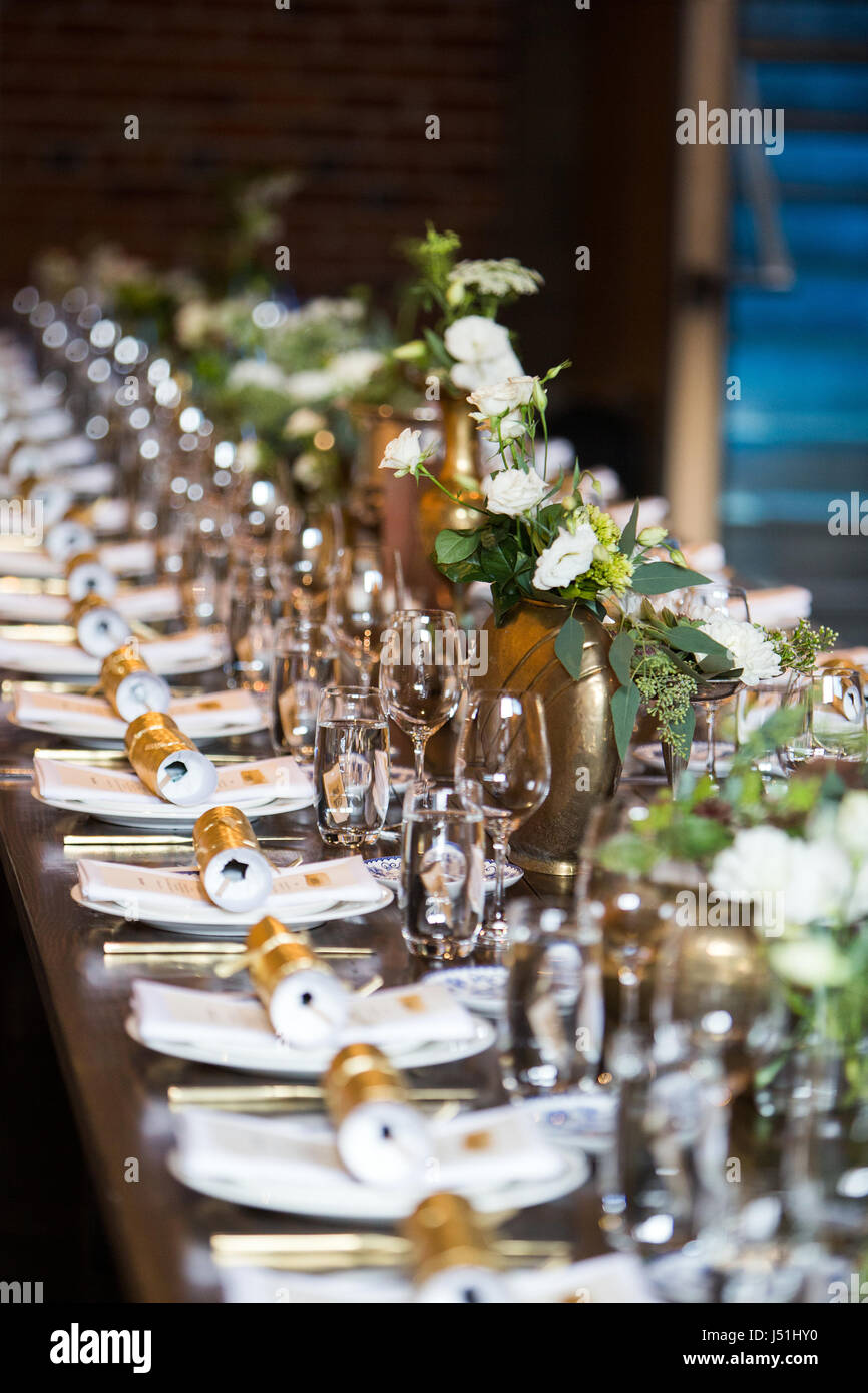 Long Table Set For Dinner With Flowers And Pull Confetti Pops Stock Photo Alamy